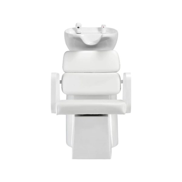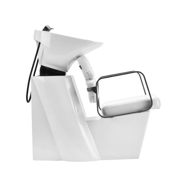 Odgovarajuća dubina bijele keramičke posude za umivaonik sprječava prekomjerno prskanje vode ili proizvoda korištenih tijekom tretmana. To omogućuje udobno i učinkovito izvođenje širokog spektra usluga. Kut nagiba zdjele može se prilagoditi, što olakšava prilagodbu individualnim potrebama. Visoka kvaliteta korištenih materijala čini umivaonik izdržljivim, otpornim na promjenu boje i ogrebotine te vrlo jednostavnim za čišćenje. Pravilno profilirani ovratnik i nagnuti naslon pružaju potporu i udobnost tijekom pranja kose, a zahvaljujući udobnoj plastičnoj kapi u nijansama crne, kupac neće osjetiti nelagodu povezanu s hladnoćom keramičke površine.