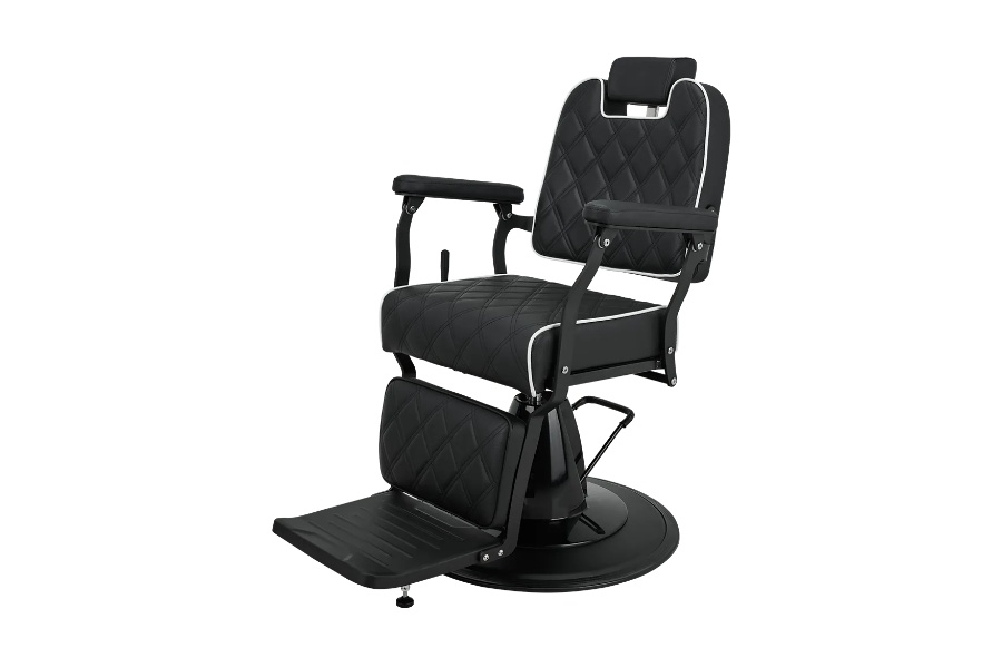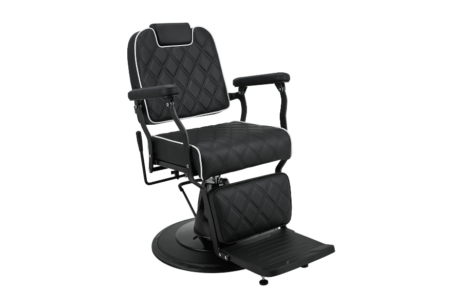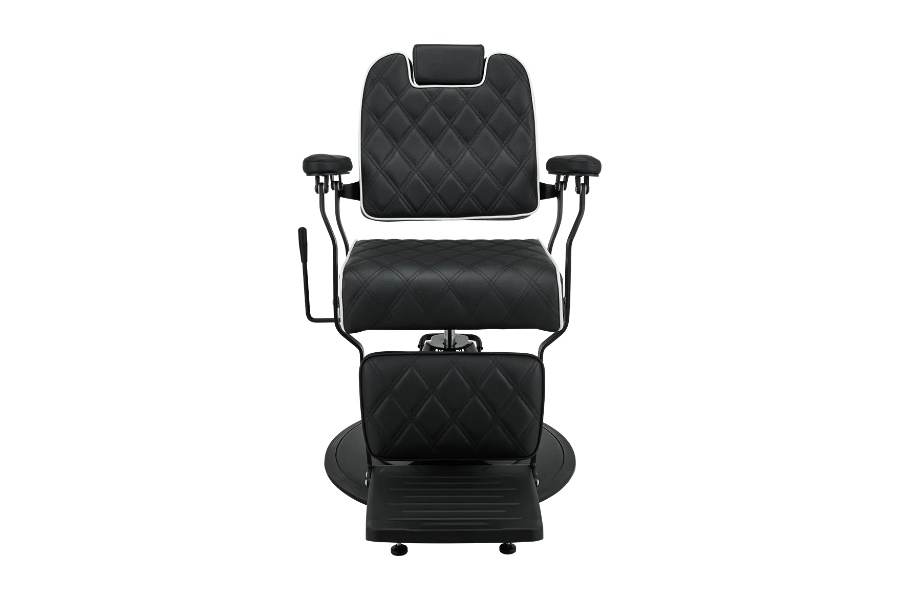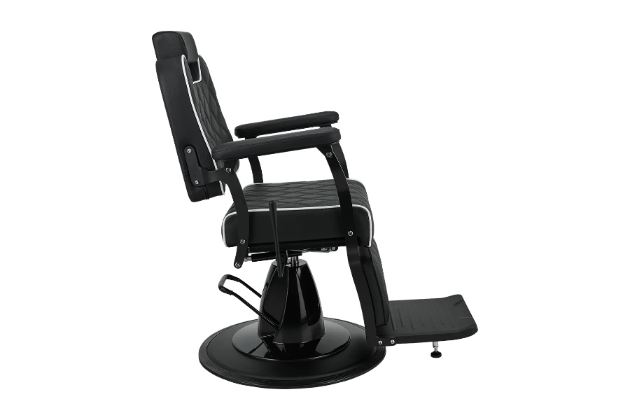 Elegancija u minimalističkom duhu. Lagani metalni okvir u kombinaciji s crnom presvlakom s geometrijskim šavovima i kontrastnim cjevovodima. Opremljena podesivim naslonom i udobnim osloncem za noge, ova stolica osigurava udobnost i za klijenta i za brijača. Izvrstan izbor za moderne brijačnice i frizerske salone. BRAVO stolica dostupna je sa sljedećim karakteristikama: Crna presvlaka Šivanje u obliku dijamanta Bijeli obrub Lagani čelični okvir u mat crnoj završnoj obradi Hidraulična pumpa s crnim kućištem Crna metalna baza diska Funkcija naginjanja za poluležeći položaj Tapecirani oslonac za noge. Mekani, tapecirani jastučići za ruke Podesivi naslon za glavu.