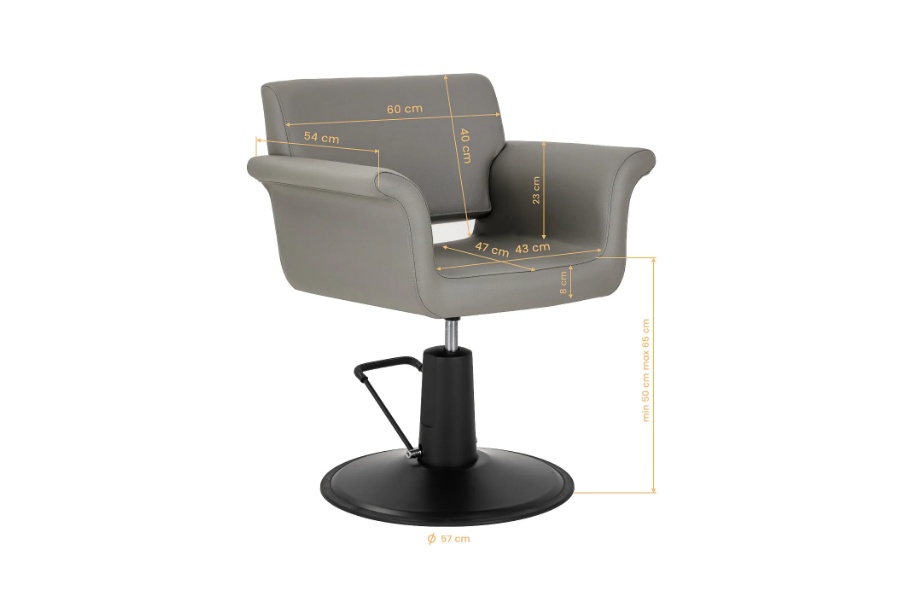Minimalistička fotelja za frizerski salon Frizerska stolica Lucca kombinira funkcionalnost s bezvremenskom estetikom. Izdržljivo hidraulično podizanje omogućuje glatko podešavanje visine , što olakšava prilagođavanje položaja potrebama stilista. Ergonomsko sjedalo s udobnim naslonom i elegantnim naslonima za ruke osigurava udobnost tijekom tretmana, dok njezin moderan, minimalistički dizajn čini stolicu savršenom za klasične i suvremene salone.  Ergonomija za udobnost rada Robusni hidraulični podizač omogućuje glatko podešavanje visine sjedala od 50 do 65 cm , čak i kada klijent sjedi u stolici. To omogućuje jednostavno podešavanje visine i klijenta i stilista, potičući ergonomsko držanje tijekom rada. Udoban naslon pruža stabilnu potporu leđima , osiguravajući udobnost čak i tijekom dugih tretmana. Mehanizam potpunog okretanja povećava slobodu kretanja i omogućuje jednostavan pristup klijentu sa svih strana.