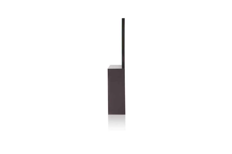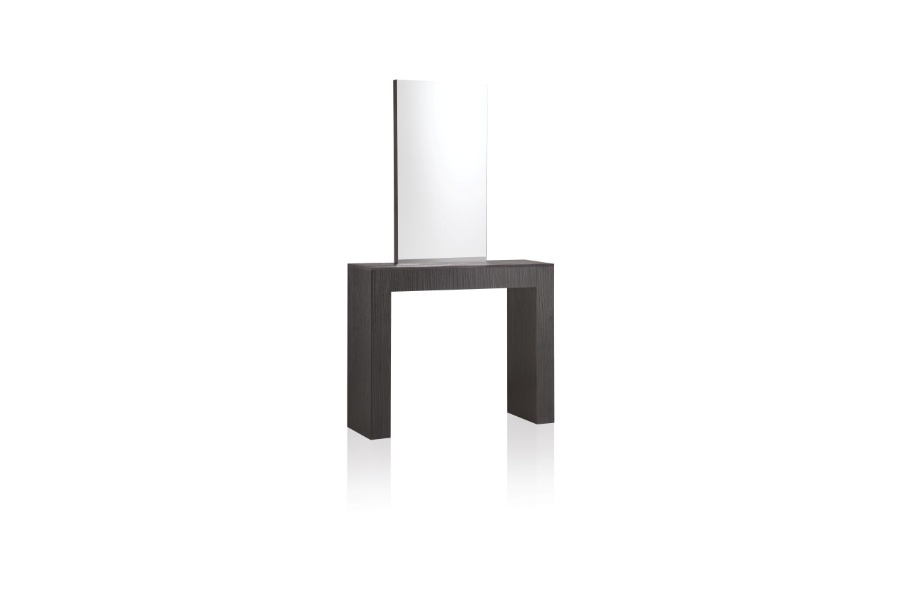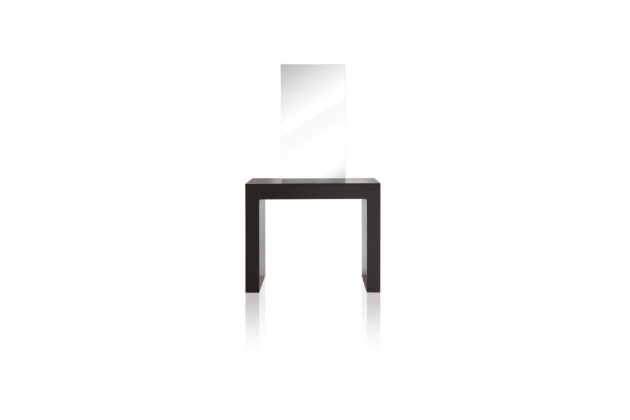 Moderna frizerska konzola s velikim ogledalom i praktičnim policama s obje strane. Sadržaj polica s jedne strane vidljiv je kroz "prozore" vrhunske završne obrade. Elegantan i istovremeno univerzalni element interijera koji će naglasiti karakter svakog frizerskog salona.