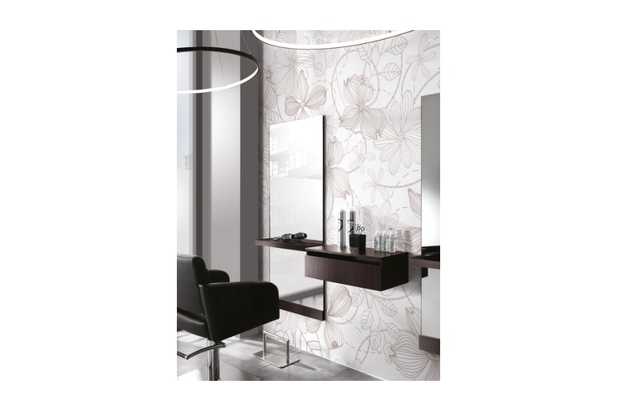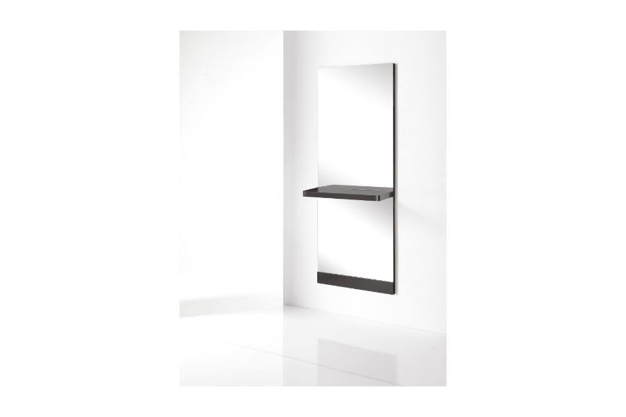 Zidno frizersko radno mjesto s debelom policom na koju kupac može prikladno staviti svoju kavu, novine ili torbicu.