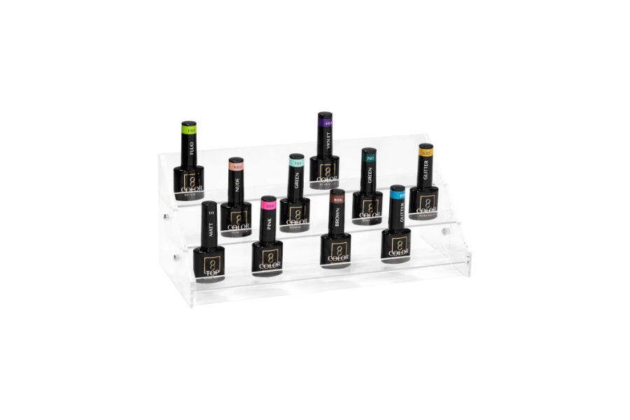 Postolje ima 3 police s osiguranim rubom, tako da lako može primiti do 24 UV gel laka. Također se može postaviti na takav način da se odlikuje s 3 dublje police i jednom plićom, tako da na nju može stati do 36 lakova! Materijal od kojeg je izrađen lako se čisti, samo koristite blagi sapun i vodu. Funkcionalni organizator spreman je za upotrebu nakon montaže. Set uključuje vijke potrebne za pričvršćivanje postolja zajedno.